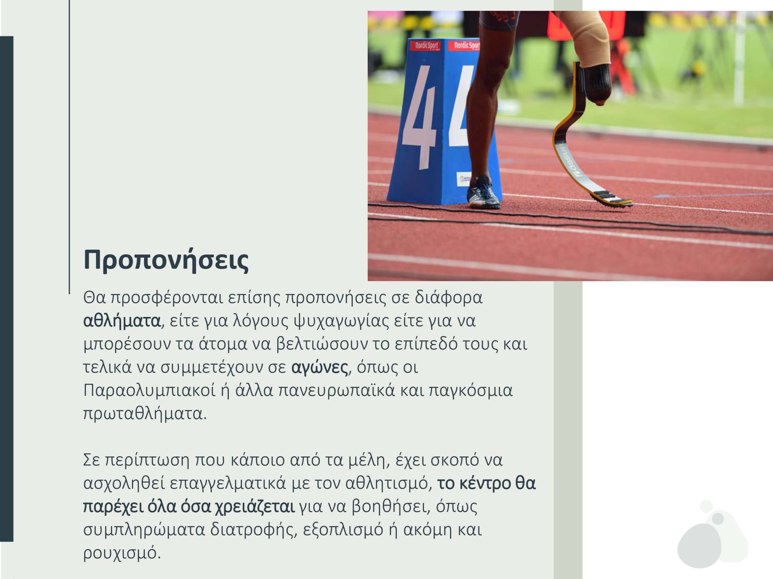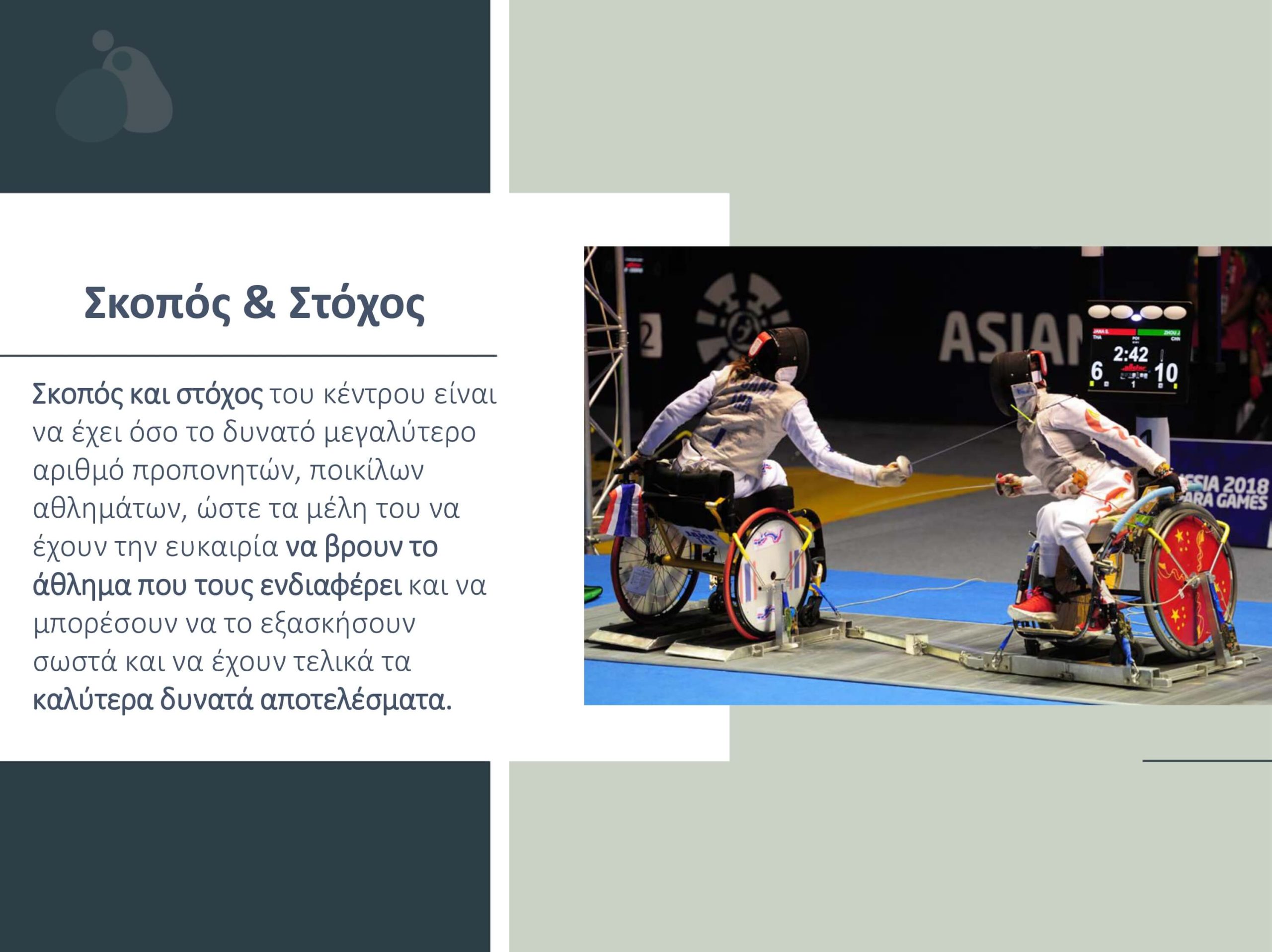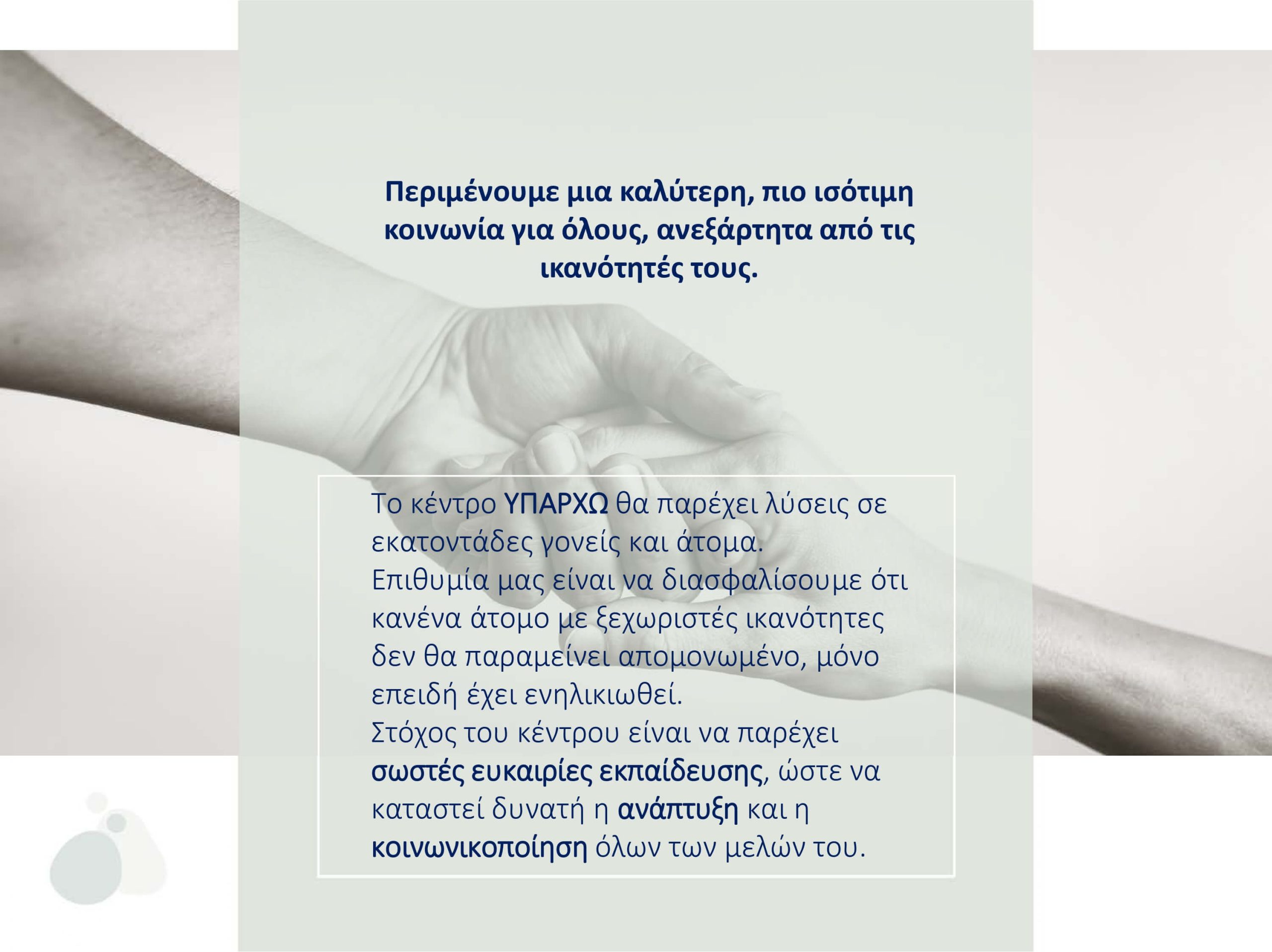 Θέλουμε να προσφέρουμε στα άτομα με διαφορετικές ικανότητες ένα ολοκληρωμένο Κέντρο υψηλών προδιαγραφών, το οποίο θα απαρτίζεται από εξαιρετικούς επαγγελματίες και θα μπορεί να τους παρέχει ό,τι χρειάζονται στην καθημερινή τους ζωή, ώστε να αναπτυχθούν και να βελτιώσουν κάθε τους ικανότητα.