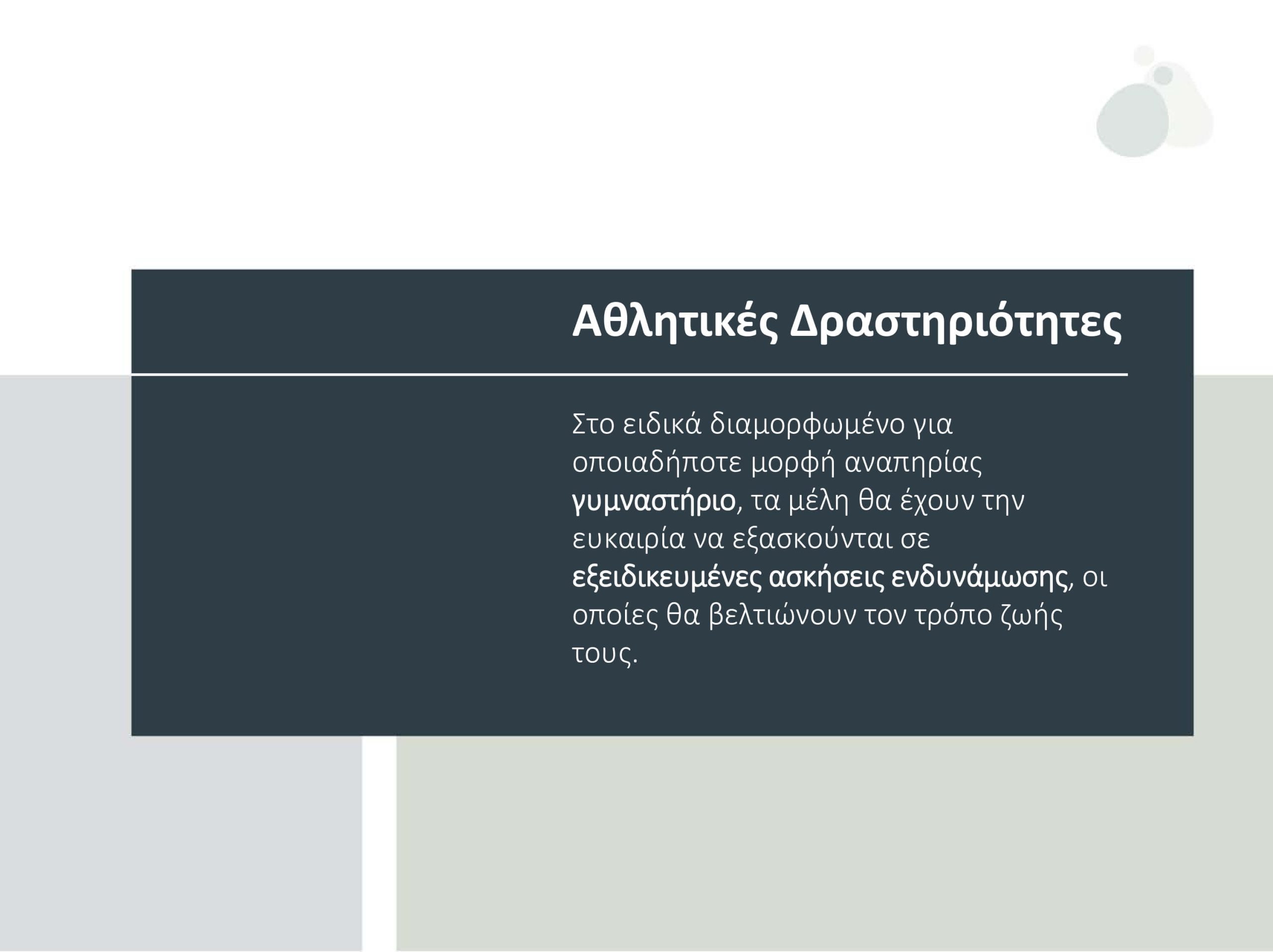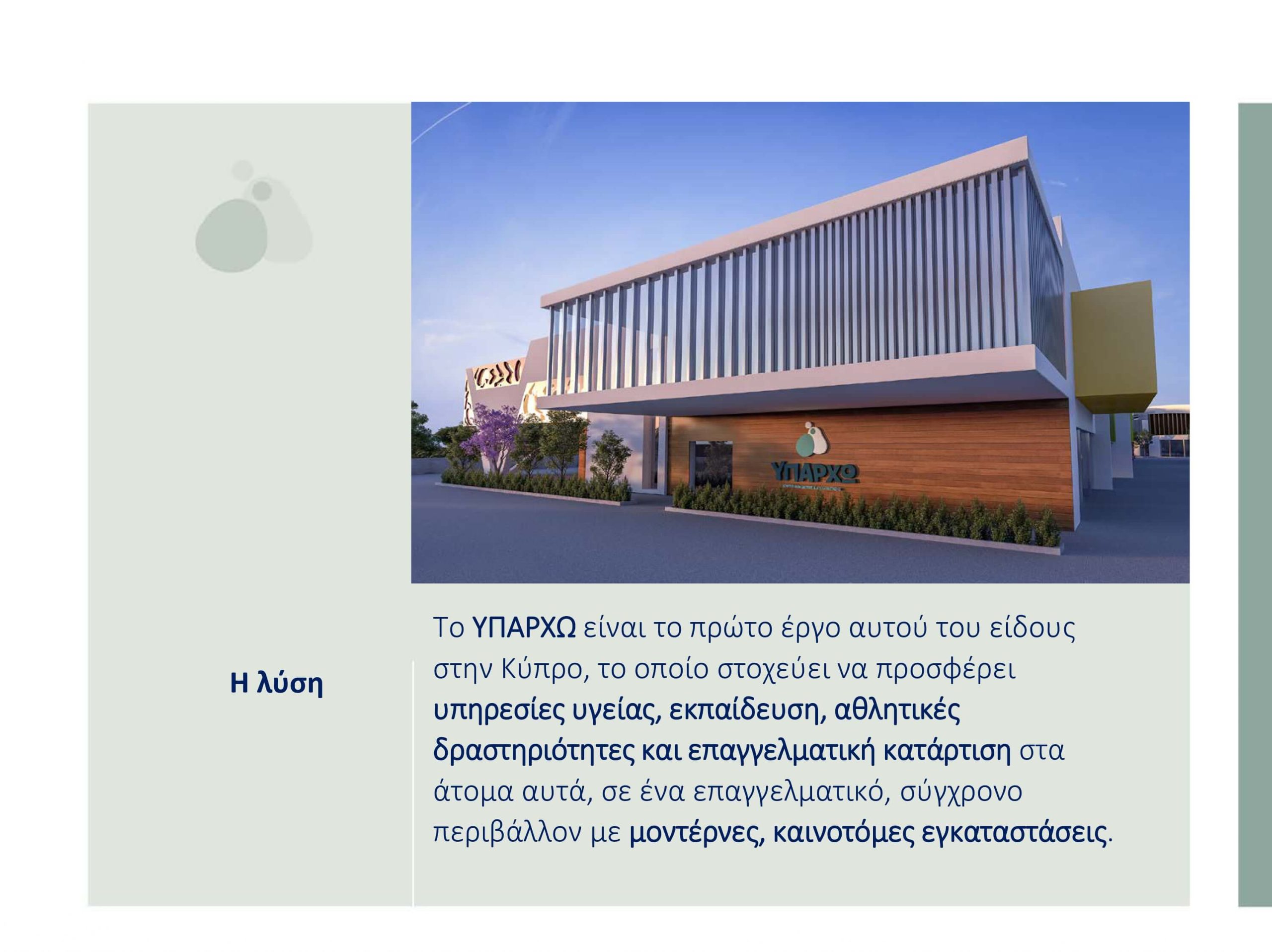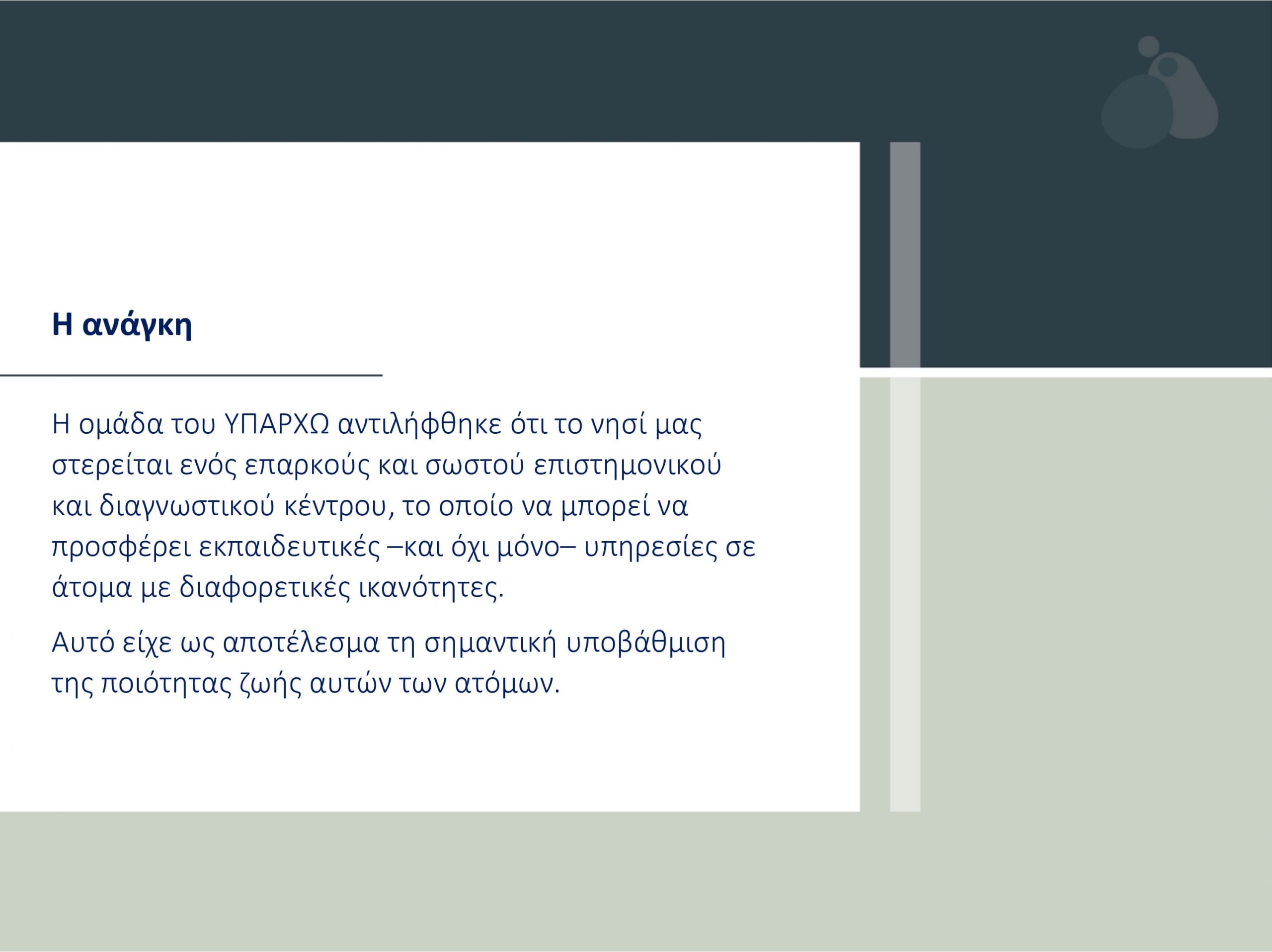 Θέλουμε να προσφέρουμε στα άτομα με διαφορετικές ικανότητες ένα ολοκληρωμένο Κέντρο υψηλών προδιαγραφών, το οποίο θα απαρτίζεται από εξαιρετικούς επαγγελματίες και θα μπορεί να τους παρέχει ό,τι χρειάζονται στην καθημερινή τους ζωή, ώστε να αναπτυχθούν και να βελτιώσουν κάθε τους ικανότητα.
