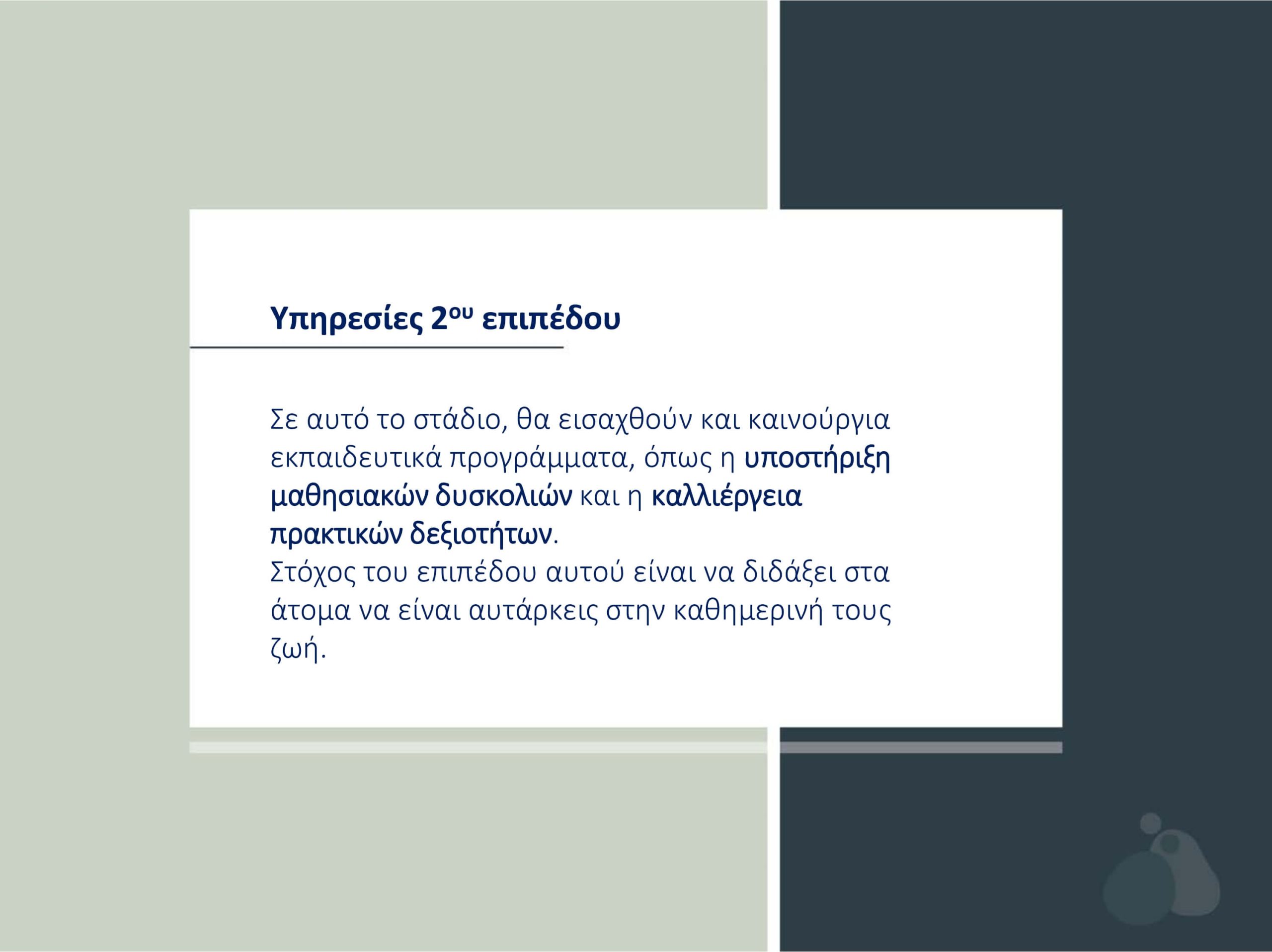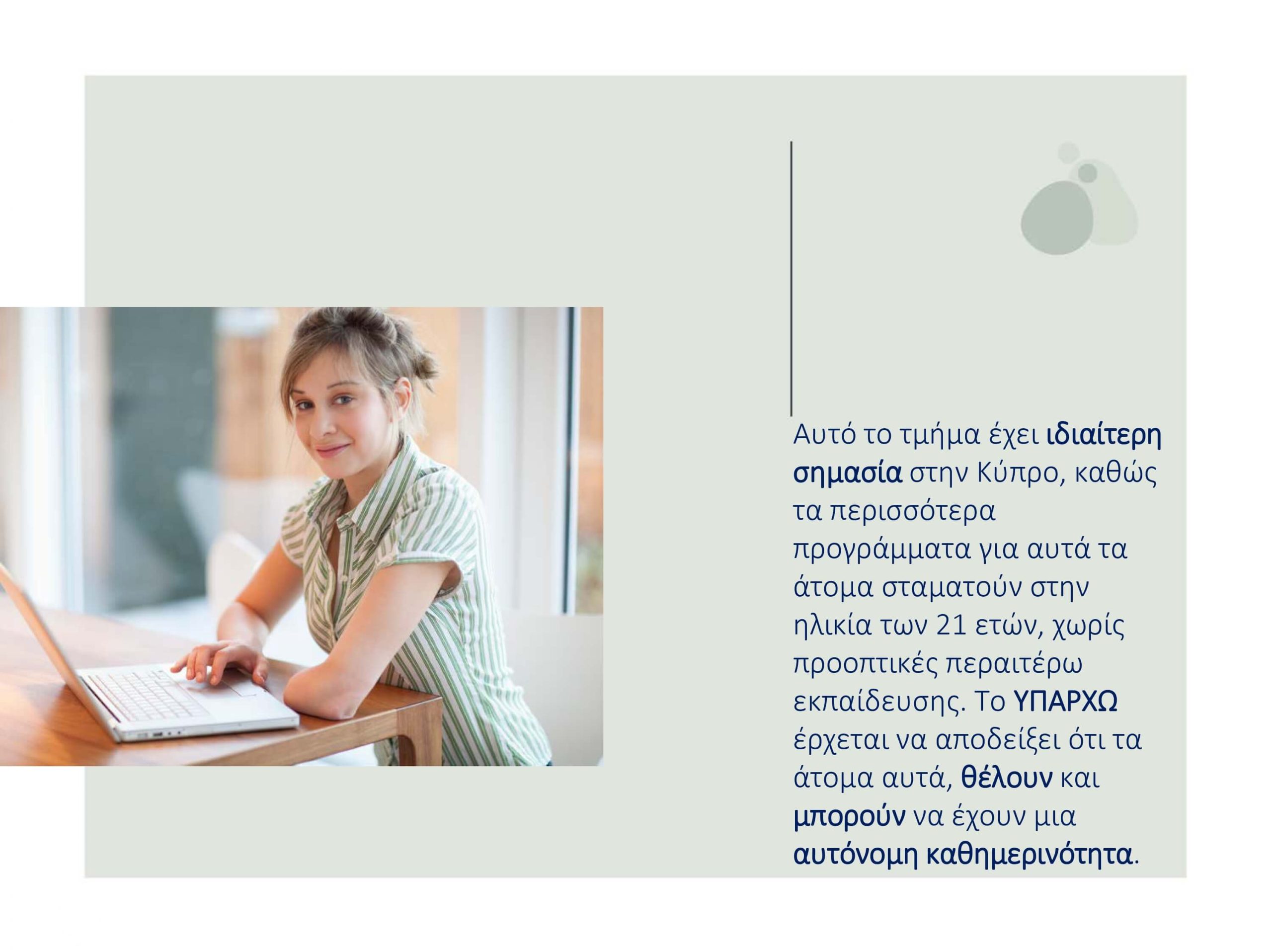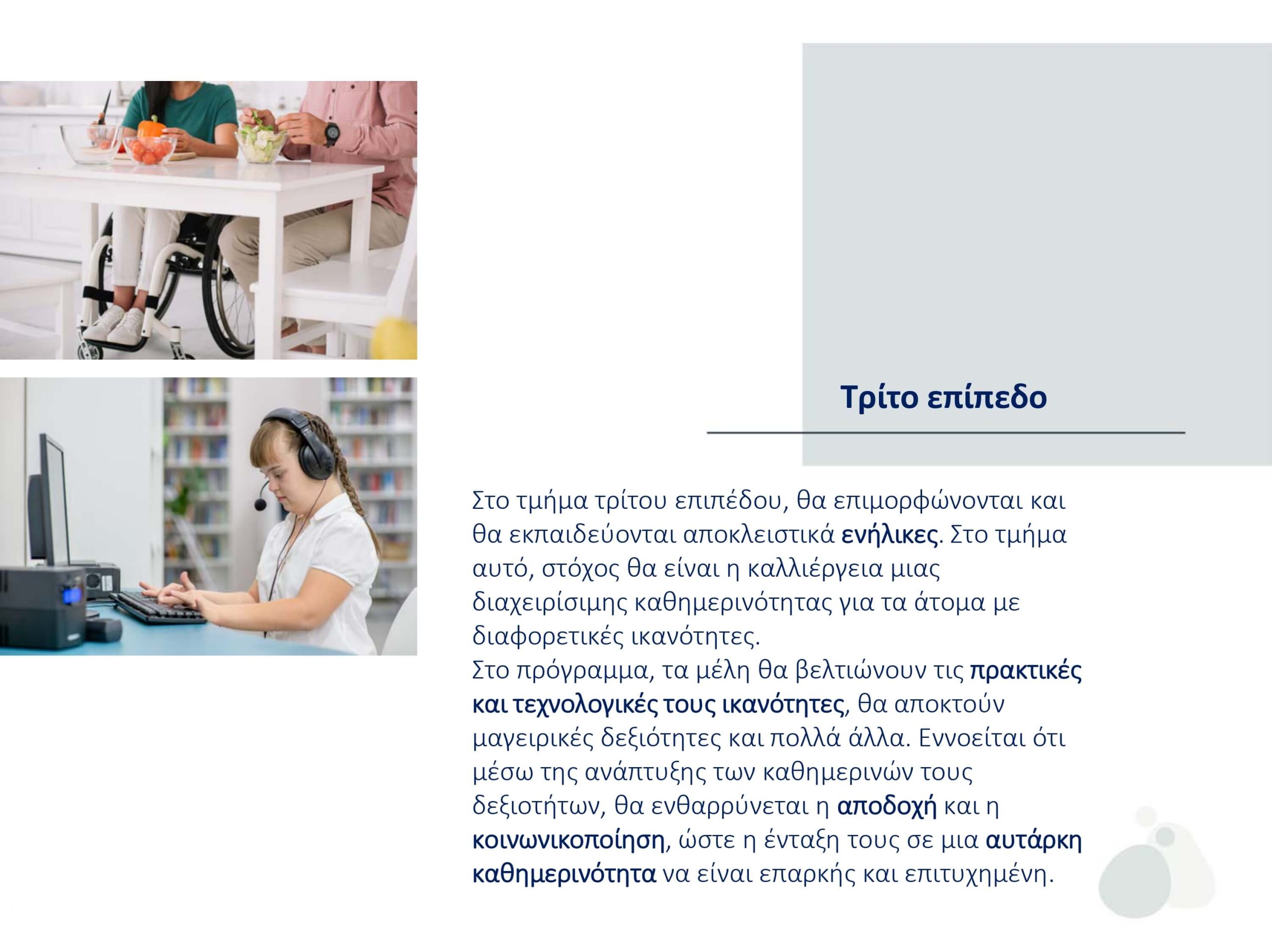 Θέλουμε να διασφαλίσουμε, μέσω της εκπαίδευσης και της ψυχολογικής στήριξης που θα παρέχουμε, ότι κανένα άτομο δεν θα παραμείνει απομονωμένο, όποιες κι αν είναι οι ικανότητές του, σε όποια ηλικιακή βαθμίδα κι αν βρίσκεται.